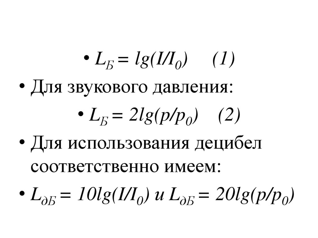 • LБ = lg(I/I0) (1)• Для звукового давления: