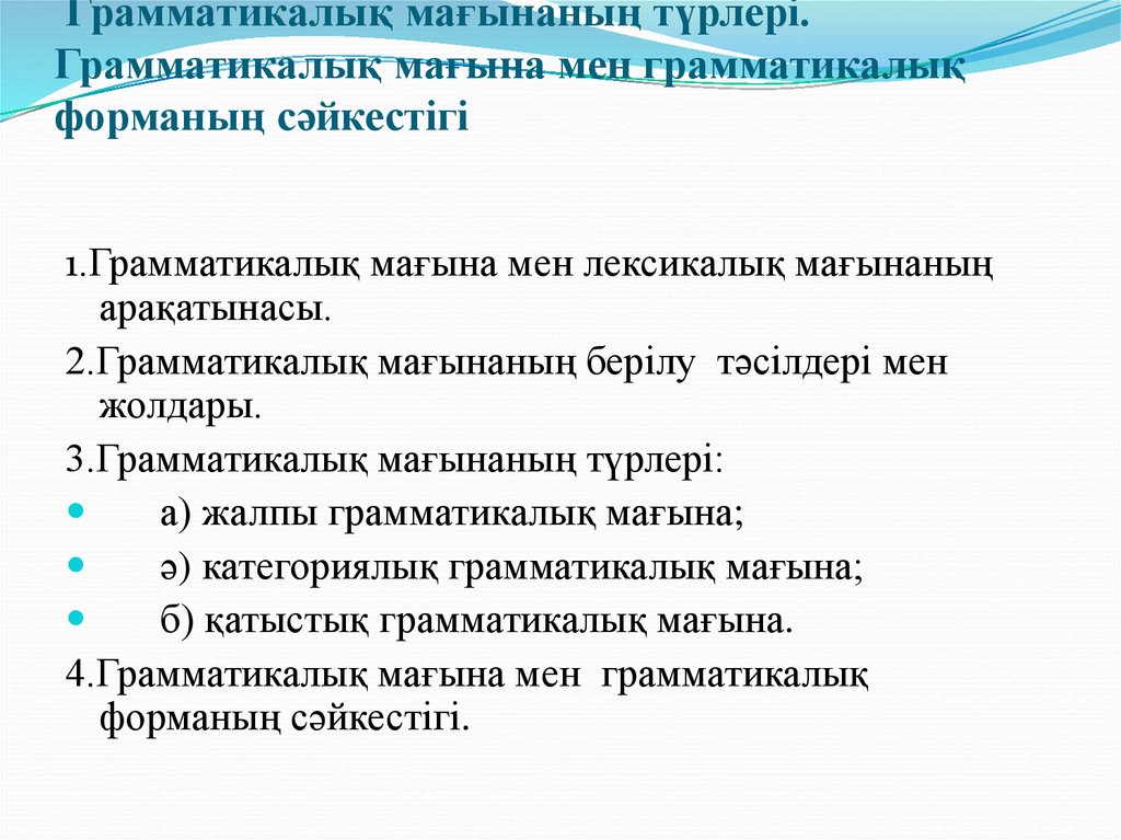 1. Грамматикалық мағынаның түрлері. Грамматикалық мағына мен грамматикалық форманың сәйкестігі