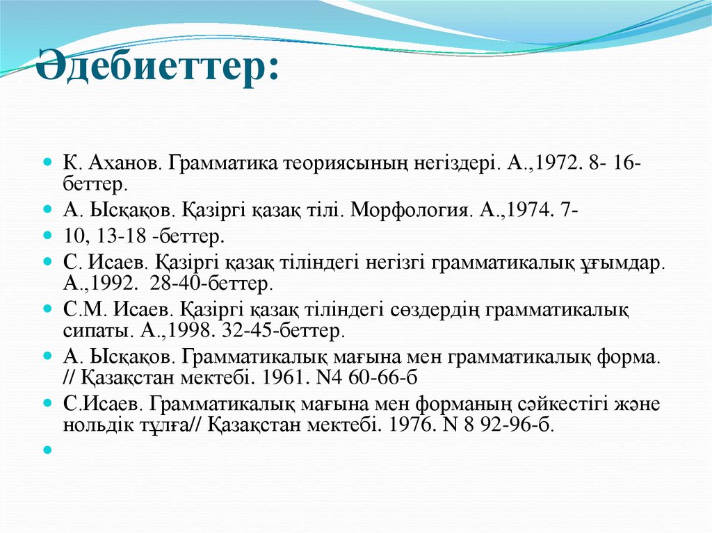 А. Ысқақов. Қазіргі қазақ тілі. Морфология. А.,1974. 7 10, 13-18 -беттер.