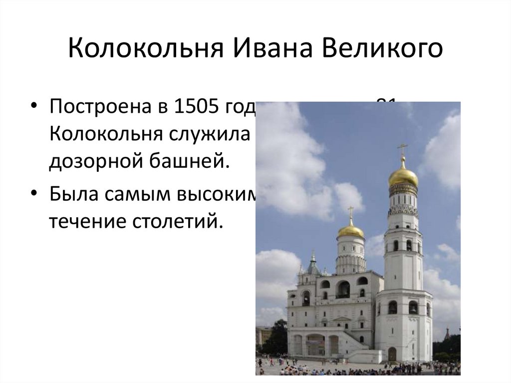 Колокольня Ивана Великого• Построена в 1505 году, высота — 81 метр.