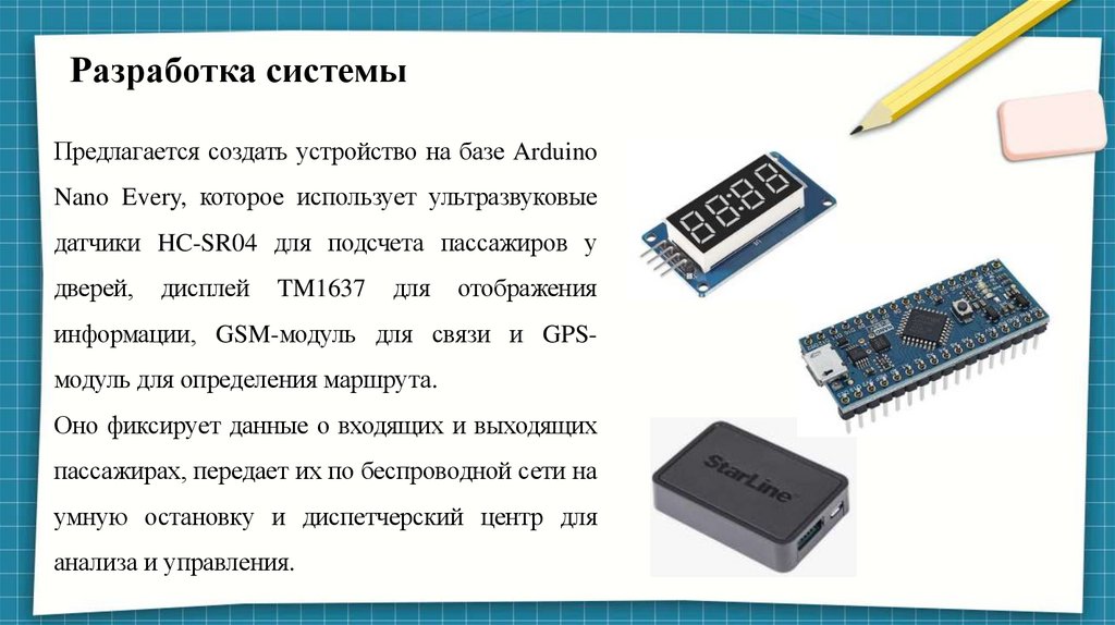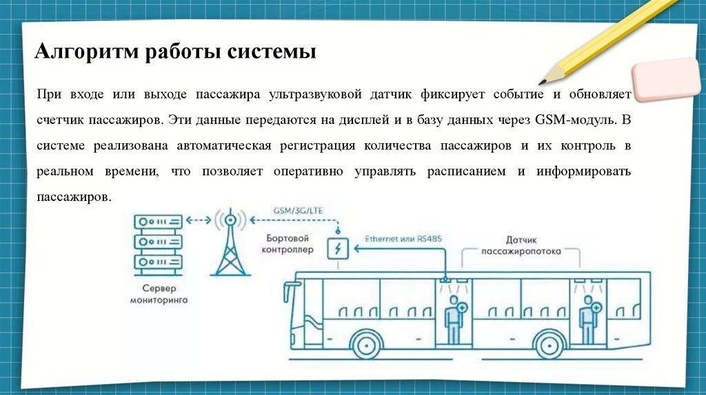 счетчик пассажиров. Эти данные передаются на дисплей и в базу данных через GSM-модуль. В