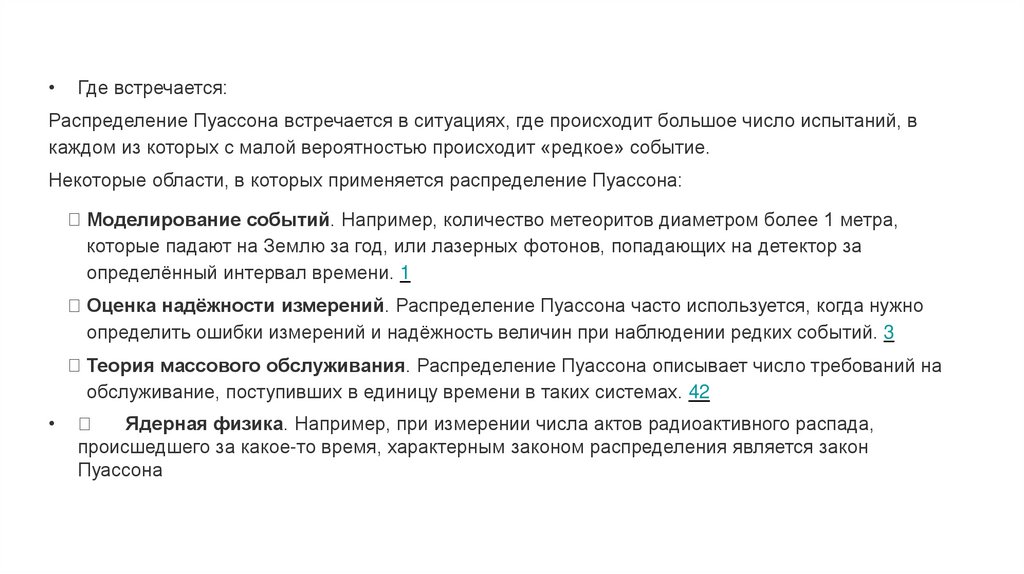 Распределение Пуассона встречается в ситуациях, где происходит большое число испытаний, в