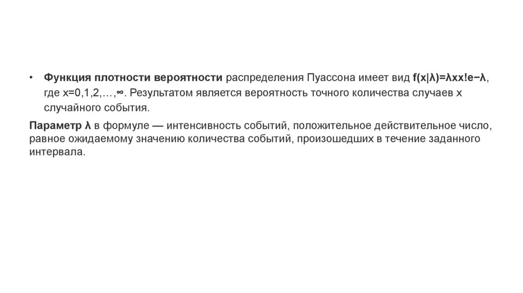 • Функция плотности вероятности распределения Пуассона имеет вид f(x|λ)=λxx!e−λ,где x=0,1,2,…,∞. Результатом является вероятность точного количества случаев x