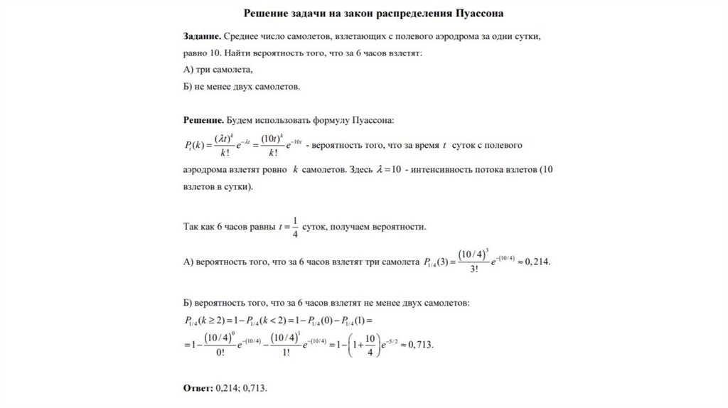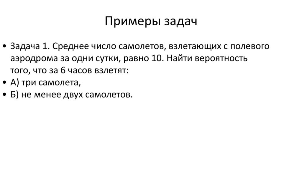 Примеры задач• Задача 1. Среднее число самолетов, взлетающих с полевого