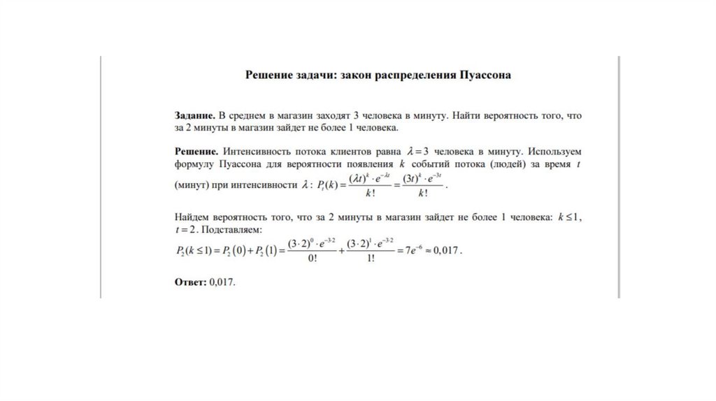 • адача 2. В среднем в магазин заходят 3 человека в минуту.Найти вероятность того, что за 2 минуты в магазин зайдет