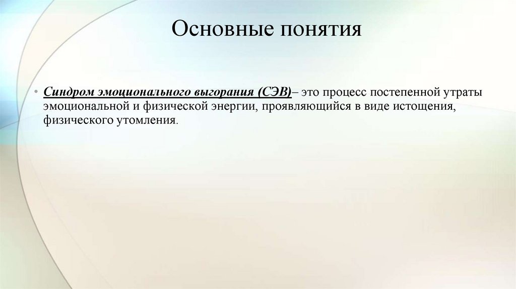 Основные понятия• Синдром эмоционального выгорания (СЭВ)– это процесс постепенной утраты