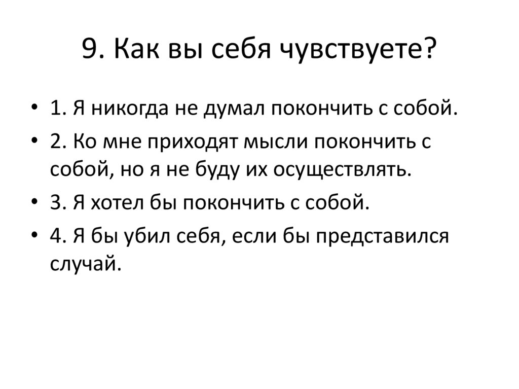 • 1. Я никогда не думал покончить с собой.• 2. Ко мне приходят мысли покончить с