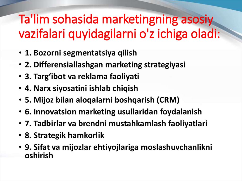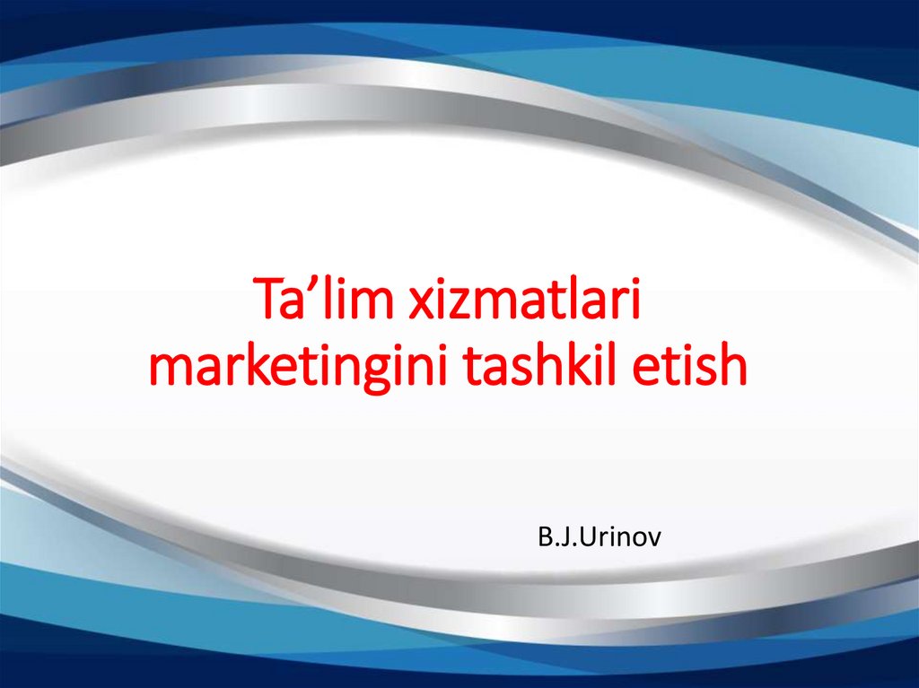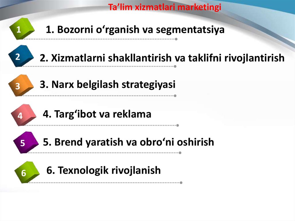 1. Ta’lim xizmatlari marketingini tashkil etish