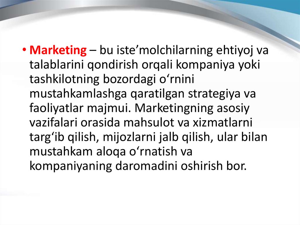 • Marketing – bu iste’molchilarning ehtiyoj vatalablarini qondirish orqali kompaniya yoki