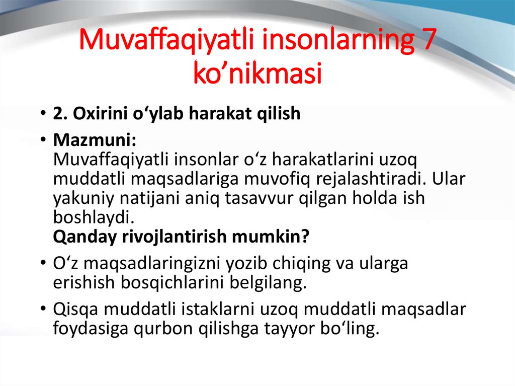 • 2. Oxirini o‘ylab harakat qilish• Mazmuni: