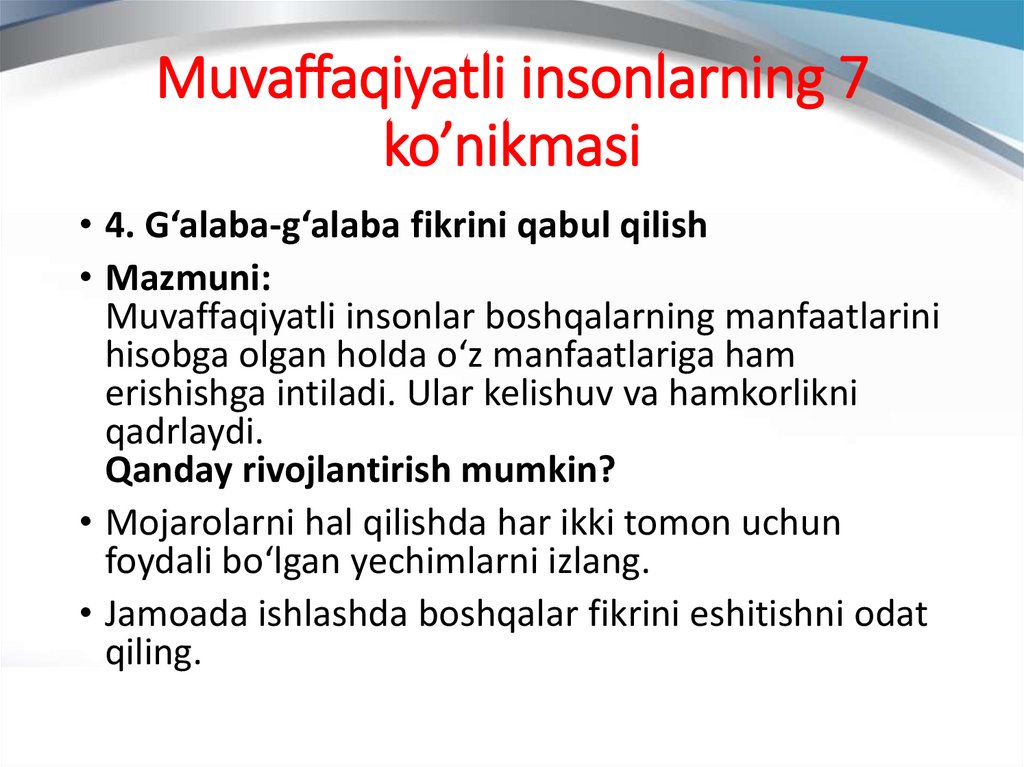 • 4. G‘alaba-g‘alaba fikrini qabul qilish• Mazmuni:
