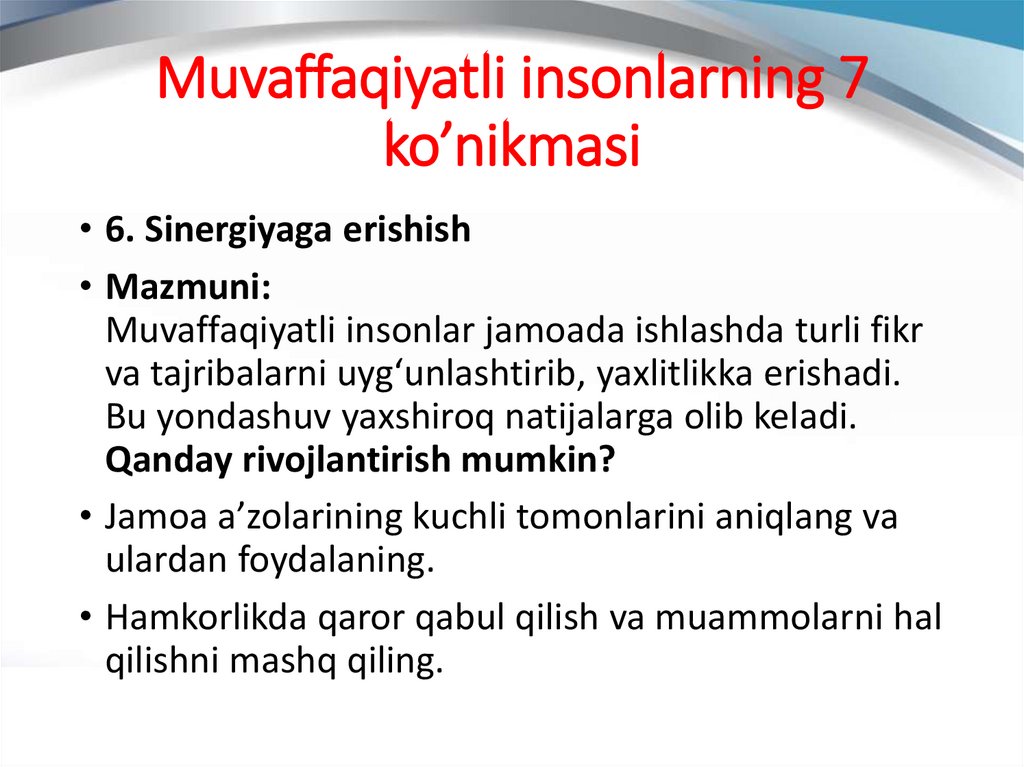 • Jamoada ishlashda boshqalar fikrini eshitishni odat