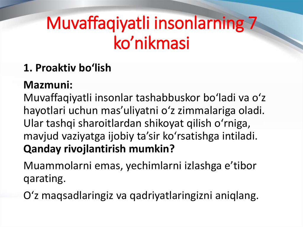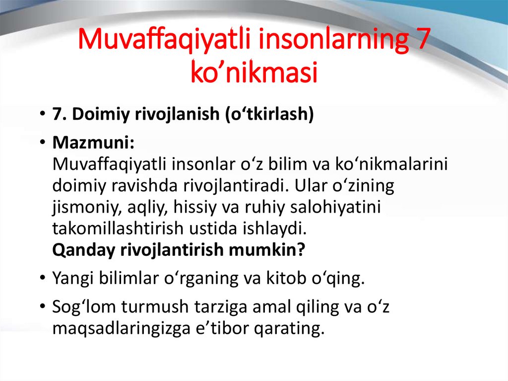 21. Muvaffaqiyatli insonlarning 7 ko’nikmasi