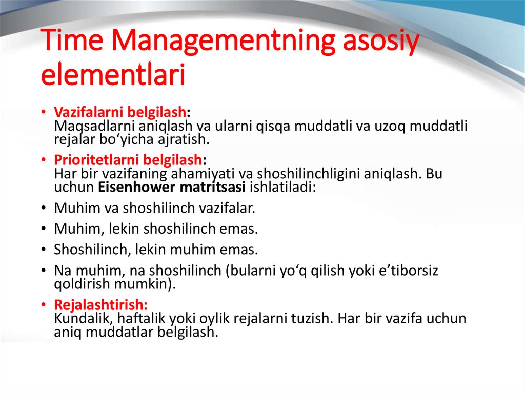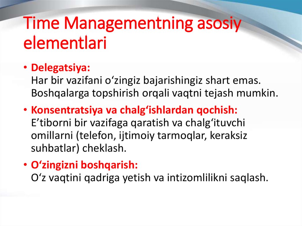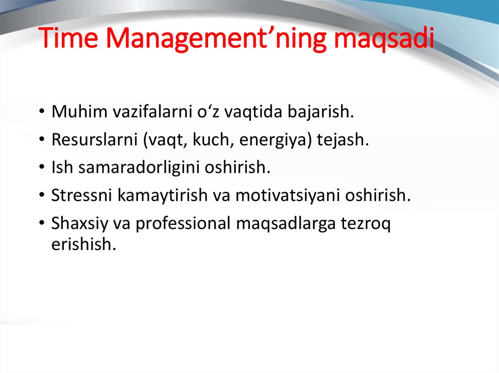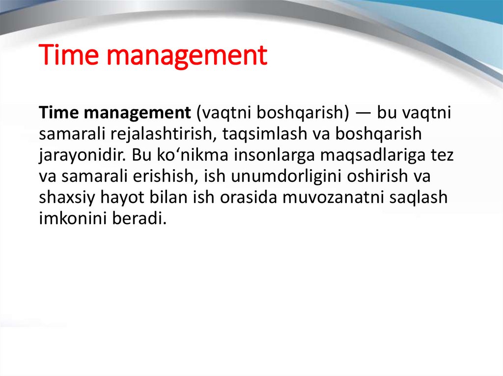 Time management (vaqtni boshqarish) — bu vaqtnisamarali rejalashtirish, taqsimlash va boshqarish