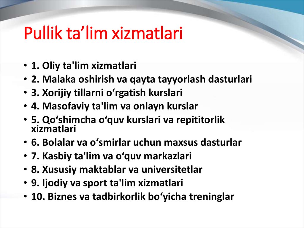 • 1. Oliy ta'lim xizmatlari• 2. Malaka oshirish va qayta tayyorlash dasturlari