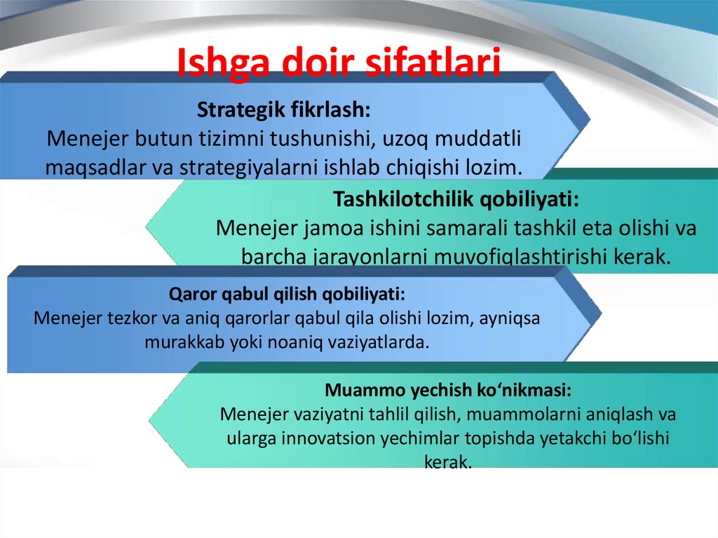 Menejer tezkor va aniq qarorlar qabul qila olishi lozim, ayniqsa