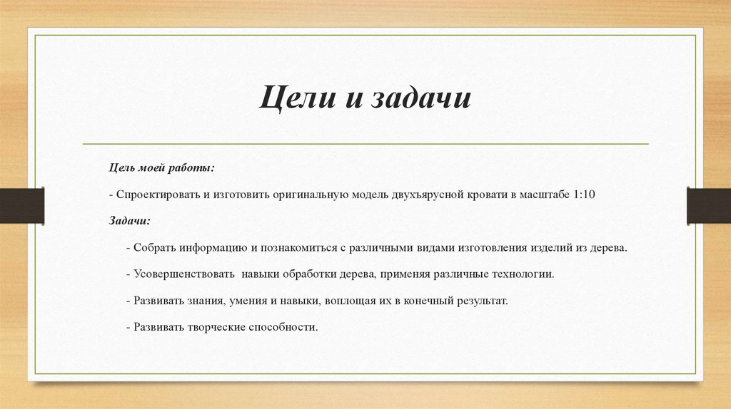 Цель моей работы:- Спроектировать и изготовить оригинальную модель двухъярусной кровати в масштабе 1:10
