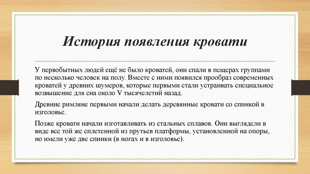 У первобытных людей ещё не было кроватей, они спали в пещерах группамипо несколько человек на полу. Вместе с ними появился прообраз современных