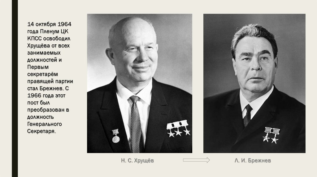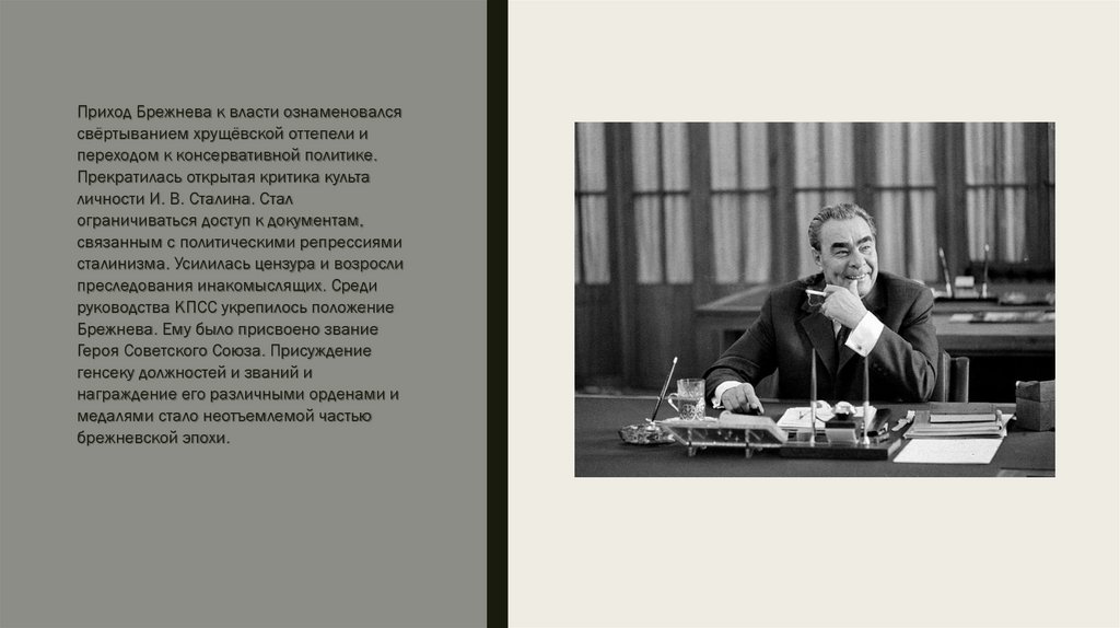 Приход Брежнева к власти ознаменовалсясвёртыванием хрущёвской оттепели и