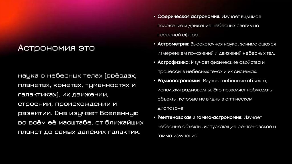 • Сферическая астрономия: Изучает видимоеположение и движение небесных светил на