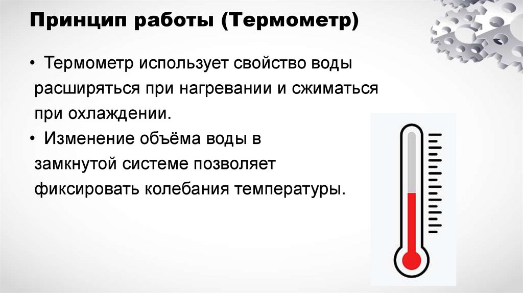 Принцип работы (Термометр)• Термометр использует свойство воды