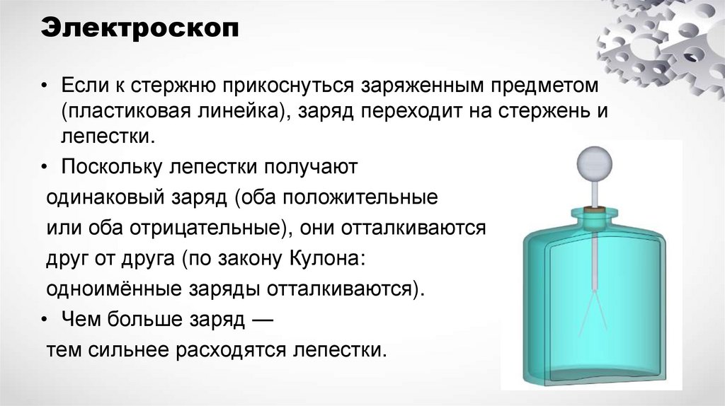 Электроскоп• Если к стержню прикоснуться заряженным предметом
