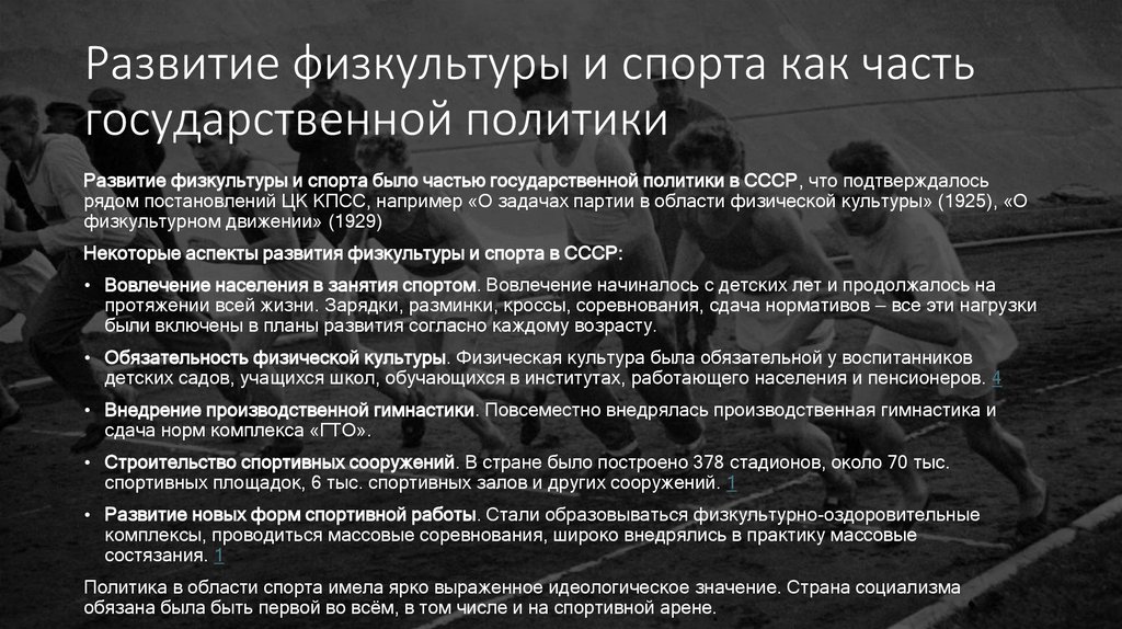 Развитие физкультуры и спорта было частью государственной политики в СССР, что подтверждалосьрядом постановлений ЦК КПСС, например «О задачах партии в области физической культуры» (1925), «О