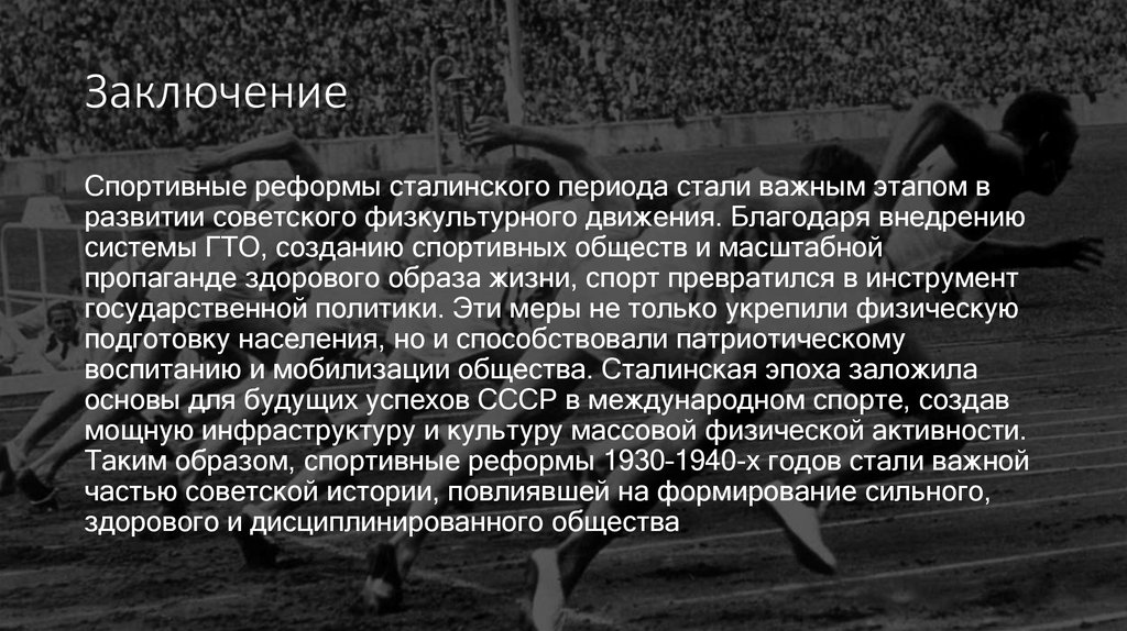 Спортивные реформы сталинского периода стали важным этапом вразвитии советского физкультурного движения. Благодаря внедрению
