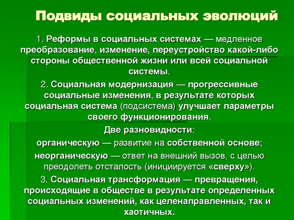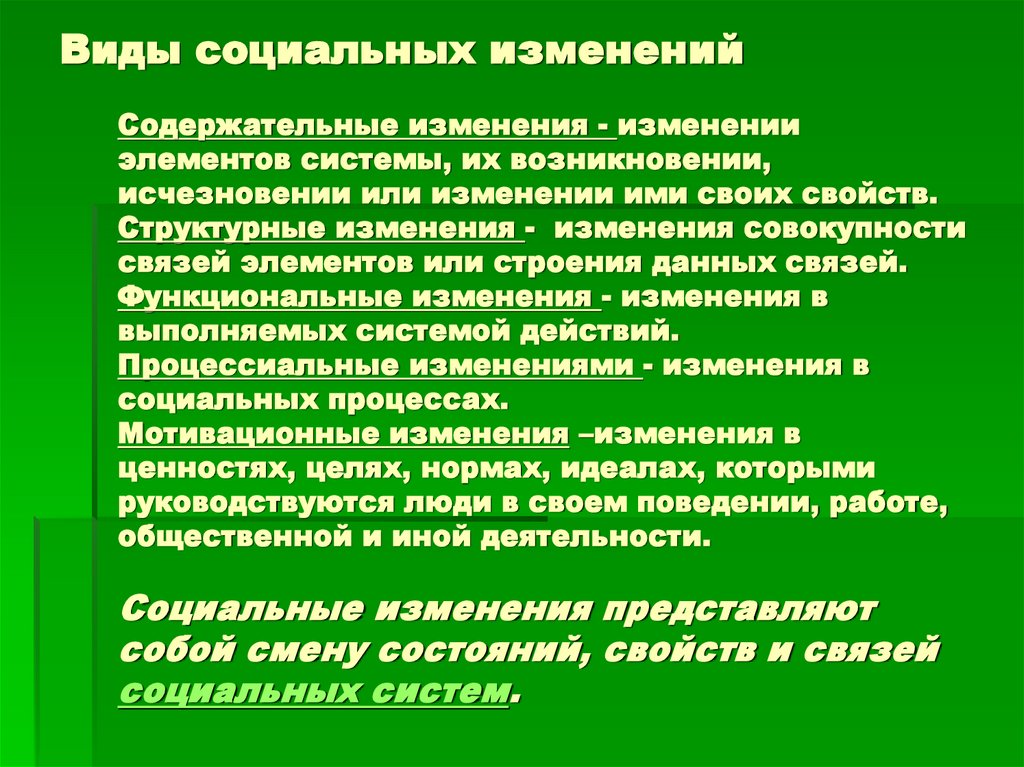7. Виды социальных изменений Содержательные изменения - изменении элементов системы, их возникновении, исчезновении или изменении