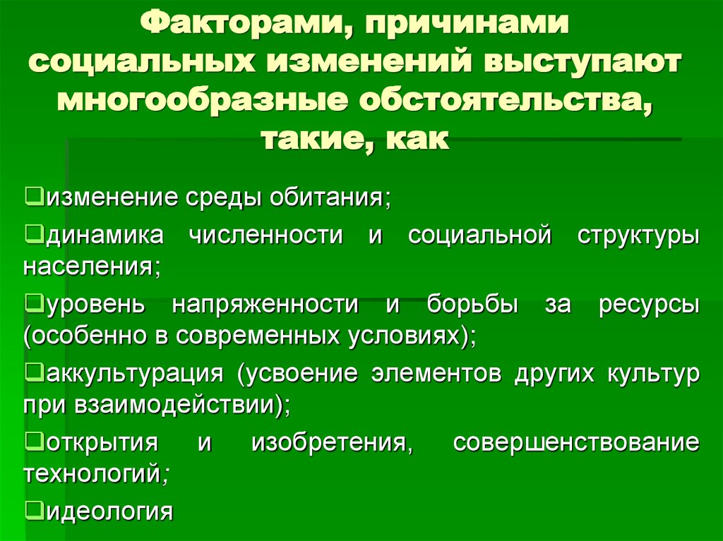 8. Факторами, причинами социальных изменений выступают многообразные обстоятельства, такие, как