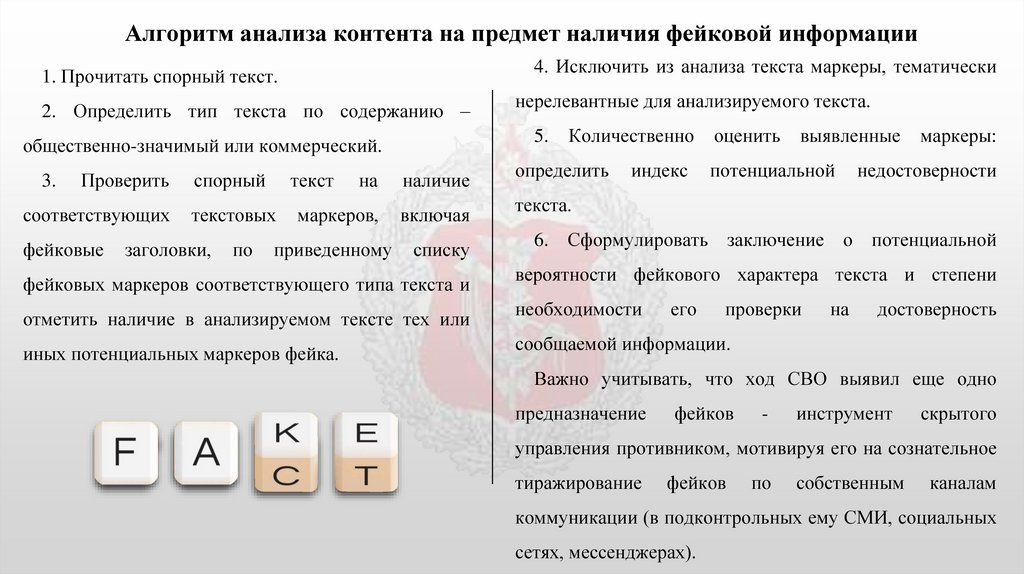 Алгоритм анализа контента на предмет наличия фейковой информации4. Исключить из анализа текста маркеры, тематически
