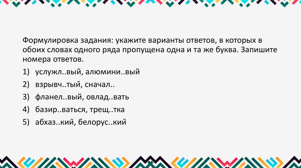 Формулировка задания: укажите варианты ответов, в которых вобоих словах одного ряда пропущена одна и та же буква. Запишите