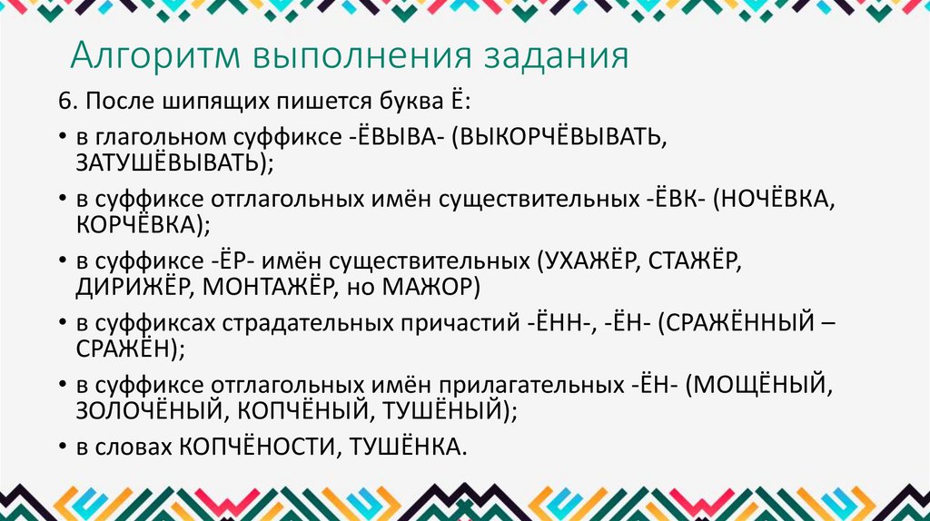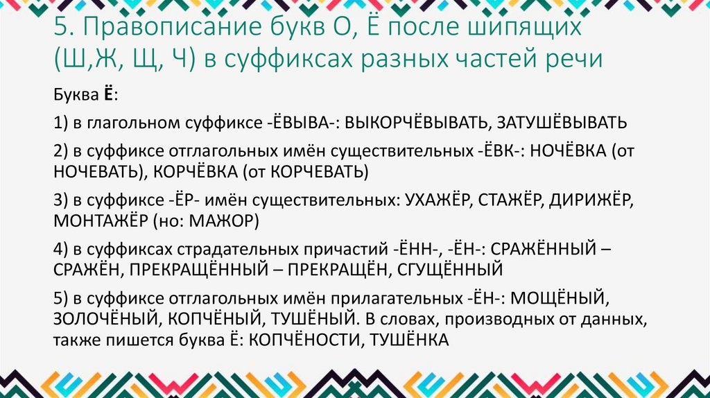 6. После шипящих пишется буква Ё:• в глагольном суффиксе -ЁВЫВА- (ВЫКОРЧЁВЫВАТЬ,