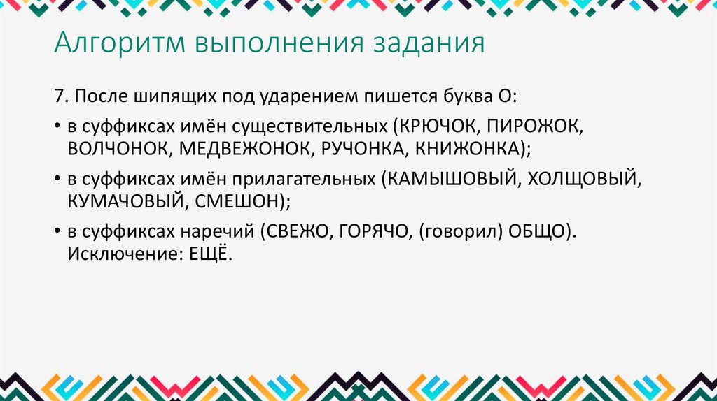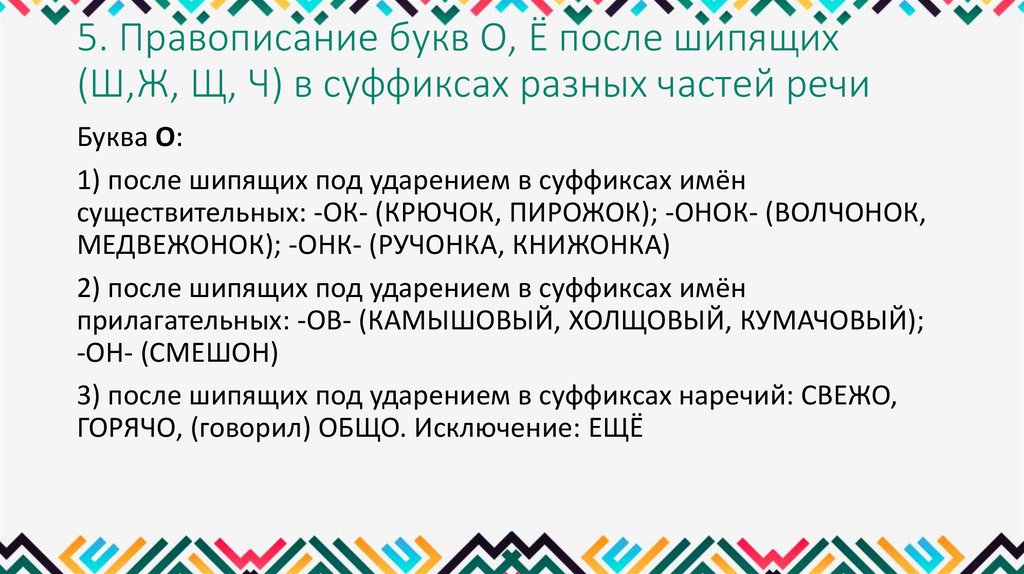 7. После шипящих под ударением пишется буква О:• в суффиксах имён существительных (КРЮЧОК, ПИРОЖОК,