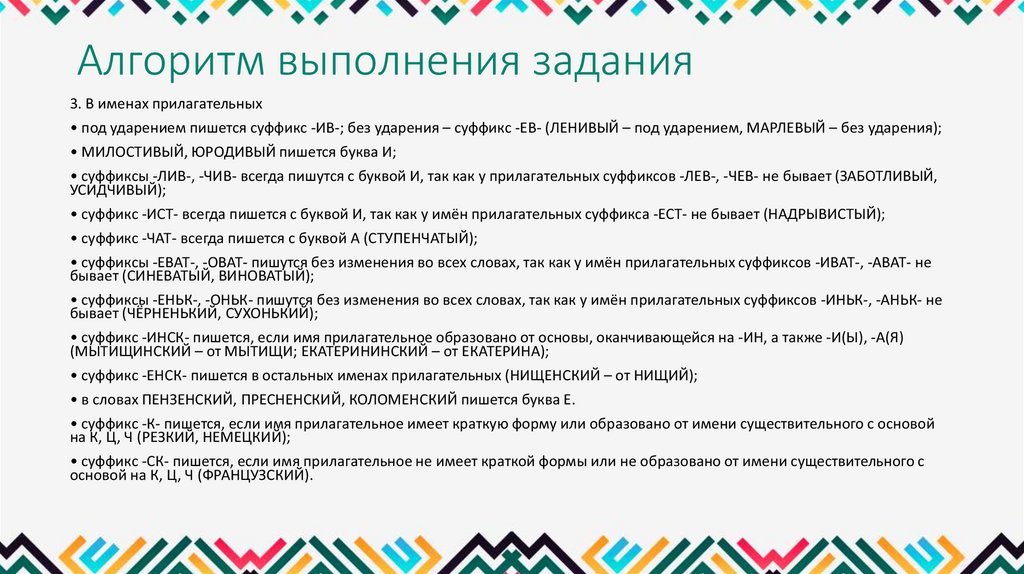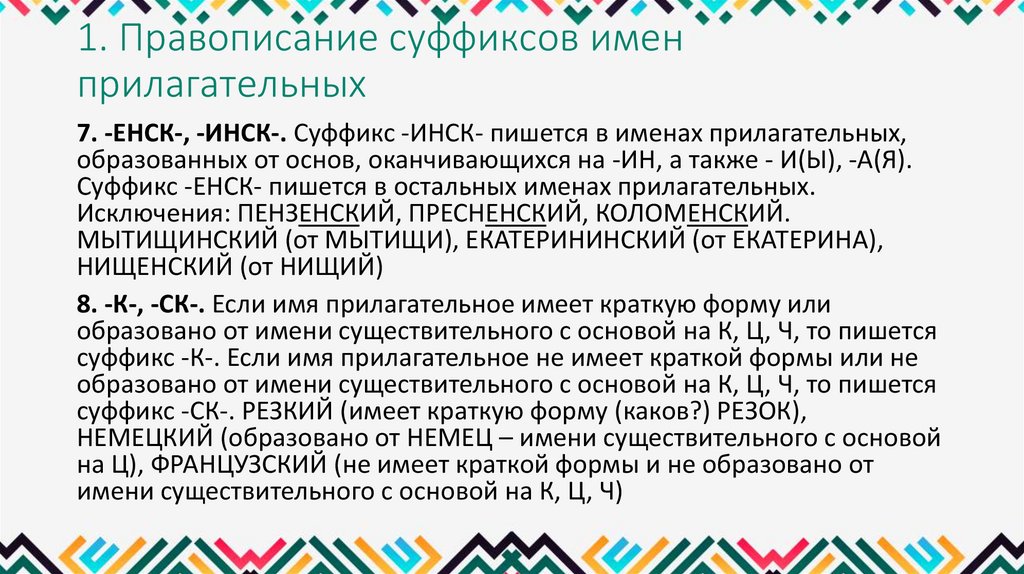 7. -ЕНСК-, -ИНСК-. Суффикс -ИНСК- пишется в именах прилагательных,образованных от основ, оканчивающихся на -ИН, а также - И(Ы), -А(Я).