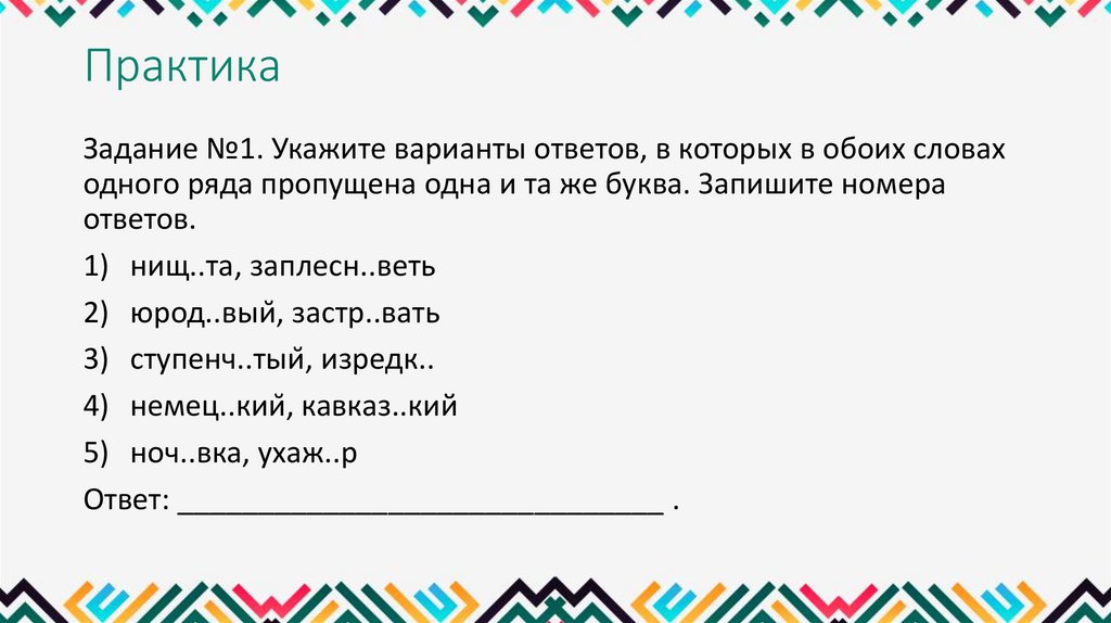 Задание №1. Укажите варианты ответов, в которых в обоих словаходного ряда пропущена одна и та же буква. Запишите номера