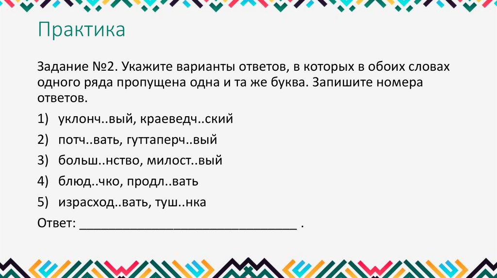 Задание №2. Укажите варианты ответов, в которых в обоих словаходного ряда пропущена одна и та же буква. Запишите номера