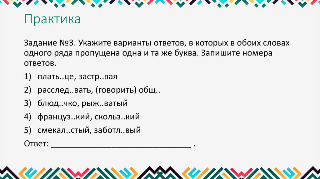 Задание №3. Укажите варианты ответов, в которых в обоих словаходного ряда пропущена одна и та же буква. Запишите номера