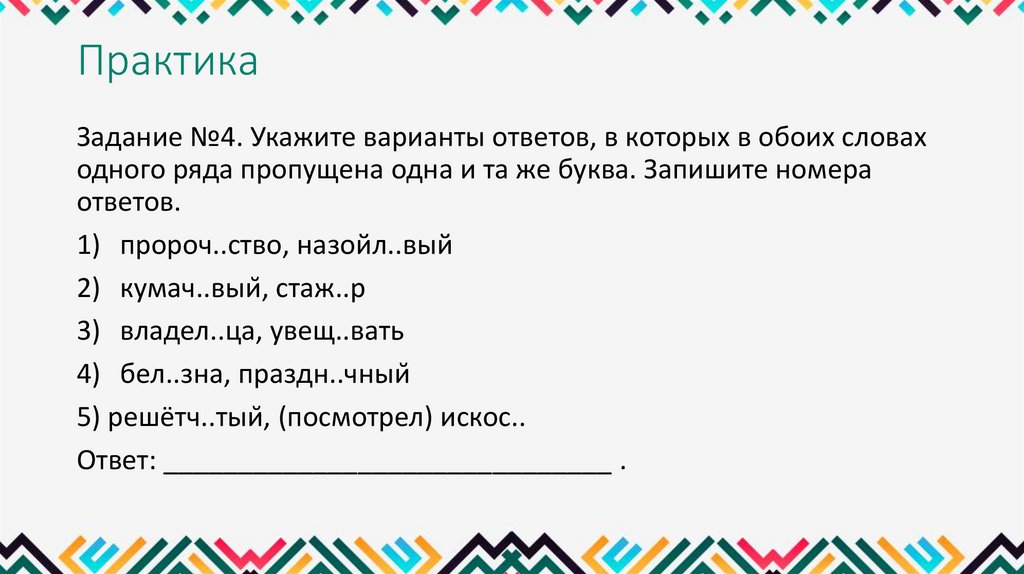 Задание №4. Укажите варианты ответов, в которых в обоих словаходного ряда пропущена одна и та же буква. Запишите номера
