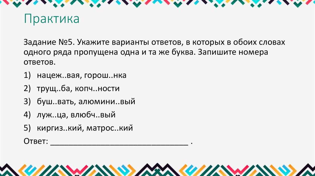 Задание №5. Укажите варианты ответов, в которых в обоих словаходного ряда пропущена одна и та же буква. Запишите номера