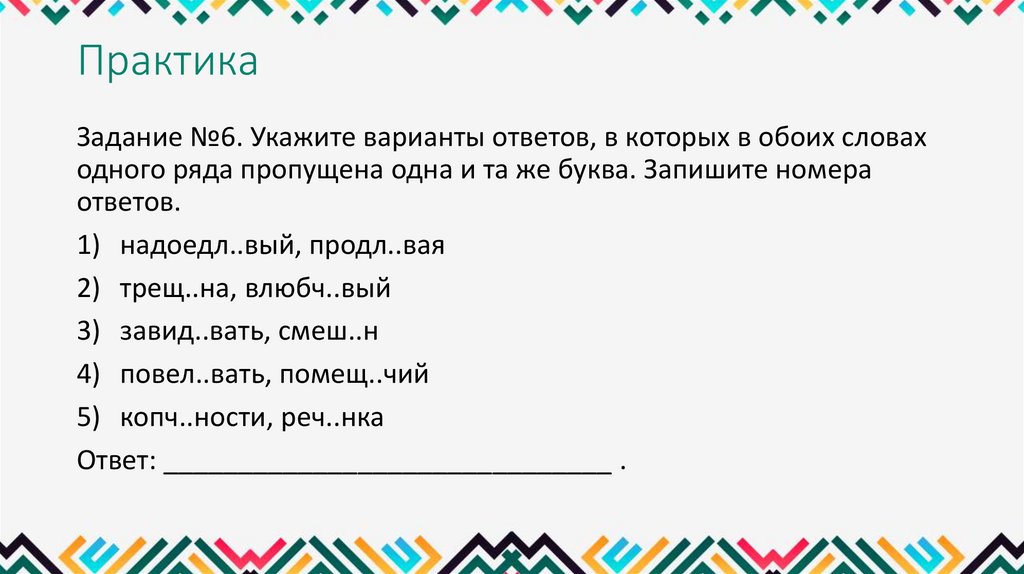 Задание №6. Укажите варианты ответов, в которых в обоих словаходного ряда пропущена одна и та же буква. Запишите номера
