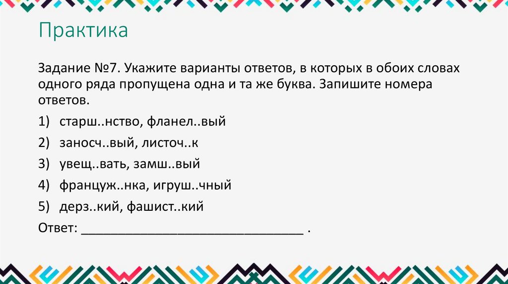 Задание №7. Укажите варианты ответов, в которых в обоих словаходного ряда пропущена одна и та же буква. Запишите номера