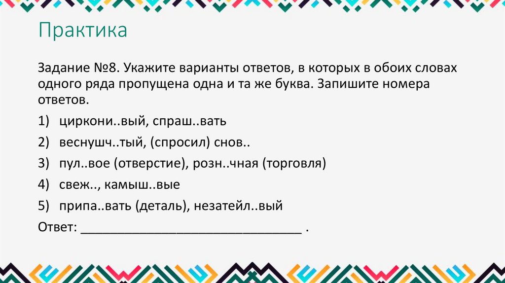 Задание №8. Укажите варианты ответов, в которых в обоих словаходного ряда пропущена одна и та же буква. Запишите номера