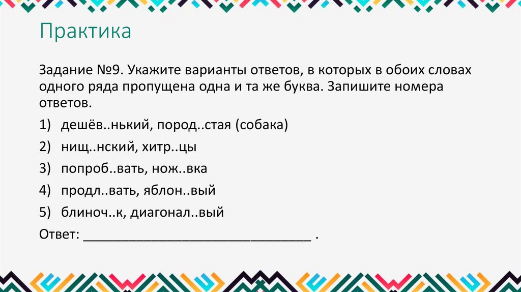 Задание №9. Укажите варианты ответов, в которых в обоих словаходного ряда пропущена одна и та же буква. Запишите номера