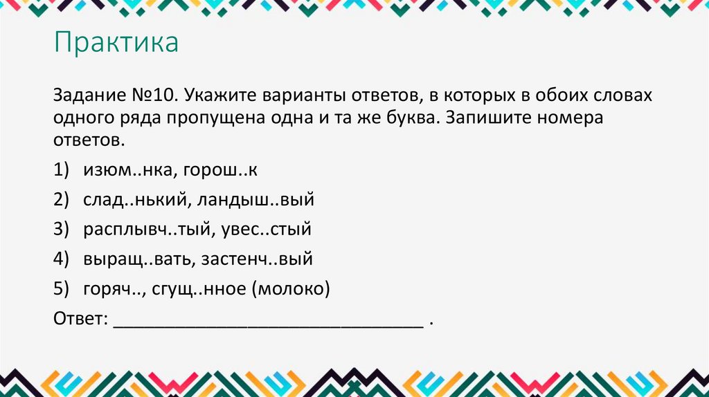 Задание №10. Укажите варианты ответов, в которых в обоих словаходного ряда пропущена одна и та же буква. Запишите номера