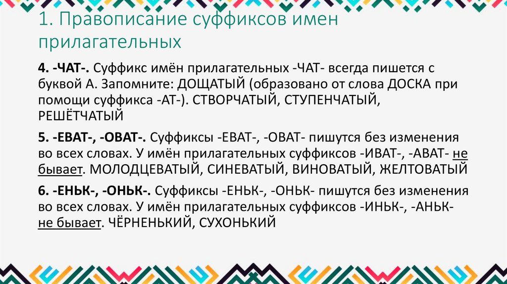 4. -ЧАТ-. Суффикс имён прилагательных -ЧАТ- всегда пишется сбуквой А. Запомните: ДОЩАТЫЙ (образовано от слова ДОСКА при