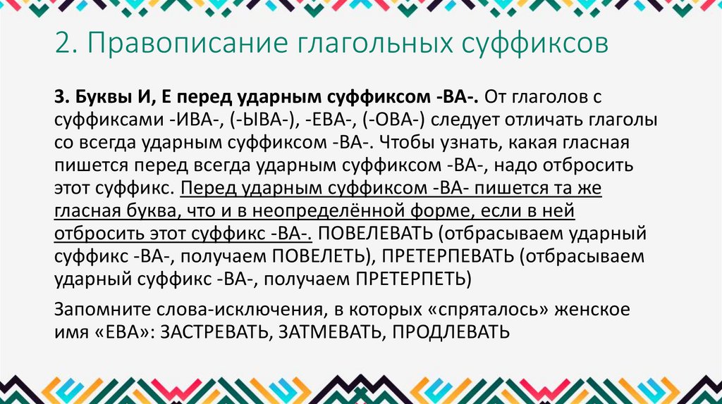 3. Буквы И, Е перед ударным суффиксом -ВА-. От глаголов ссуффиксами -ИВА-, (-ЫВА-), -ЕВА-, (-ОВА-) следует отличать глаголы