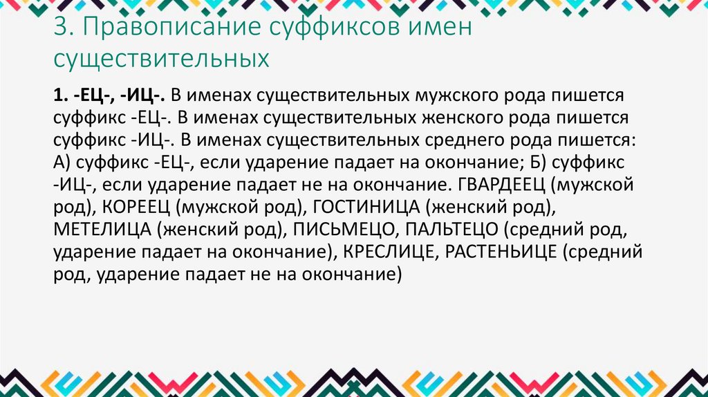1. -ЕЦ-, -ИЦ-. В именах существительных мужского рода пишетсясуффикс -ЕЦ-. В именах существительных женского рода пишется