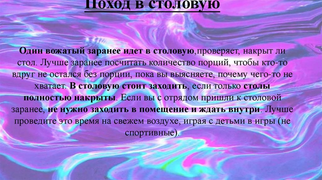 Поход в столовуюОдин вожатый заранее идет в столовую,проверяет, накрыт ли