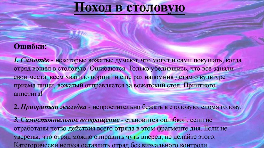 1. Самотёк - некоторые вожатые думают, что могут и сами покушать, когда